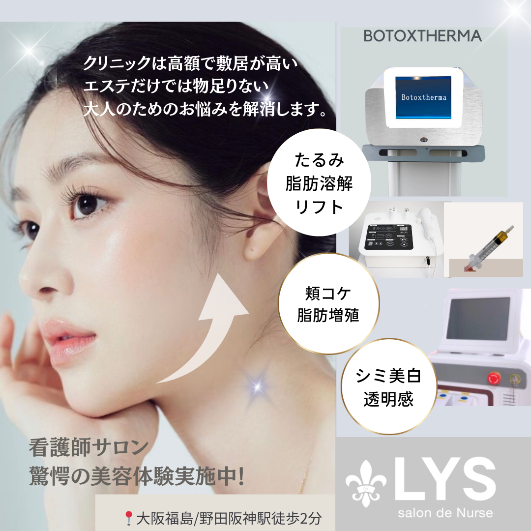 LYS salon de Nurse (リスサロンドナース)は、しみやたるみなどを看護師が美容機器を使用して改善させ、正しいスキンケアをご提案し、見た目の年齢を健康的に若々しく維持することを目的としたサロンです。美容医療の現場で実際に施術経験のある看護師が施術を行います。皮膚や筋肉の解剖を理解し、各種レーザーを安全に効果的に照射します。クリニックよりも気軽に通えて、エステサロンよりも効果を実感していただける看護師サロンを目指します。クリニックではないので、診断や治療を必要とする方は、受診をおすすめ致します。